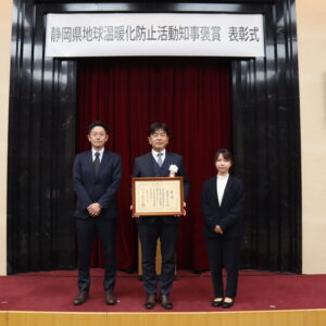 静岡県では、「静岡県地球温暖化防止条例」に基づき、地球温暖化防止に顕著な功績のあった個人又は団体に対し、その功績をたたえるため、知事が表彰を行っています。令和7年度の受賞者4団体の一つとして弊社が知事褒章を受章しました。